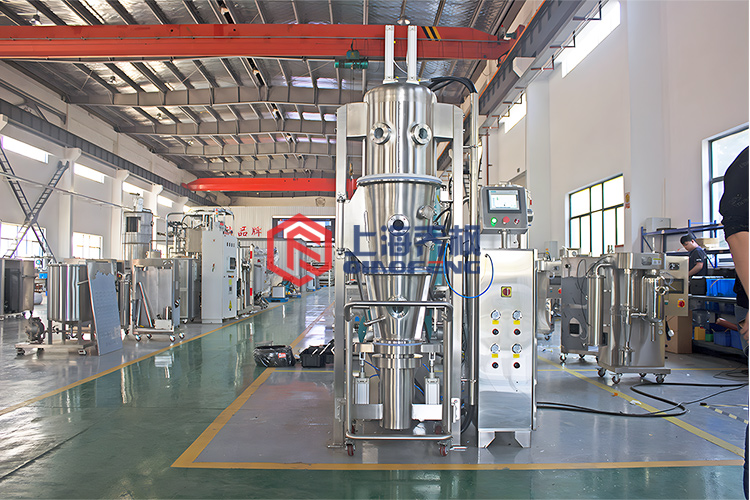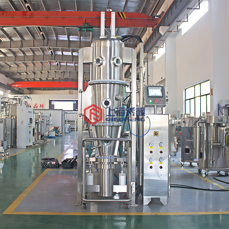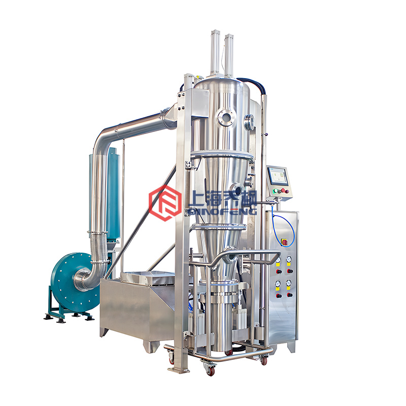 將制粒用粉末或包衣用顆粒(粉)物料投入流化床內,冷空氣從主機后部加熱室進入,經初效.中效過濾.加熱器加熱至進風所需溫度后進入流化床,粉末(顆粒)在床內呈流態(tài)化,制粒用粘結劑由輸液泵送入雙流體霧化器,經霧化后噴向流化的物料。掩味、防潮、防氧化、防水、隔熱、著色、隔離包衣。